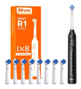 Rotating Electric Toothbrush for Adults, 8 Brush Heads (2 Types) & Travel Case, 5 Cleaning Modes Rechargeable Power Toothbrush with 2-Minute Smart Timer, Black