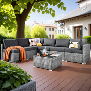 LHBcraft 7 Pieces Outdoor Wicker Rattan Patio Furniture, Wicker Rattan Outdoor Sectional Sofa Set with Coffee Table & Gery Cushions for Garden, Poolside